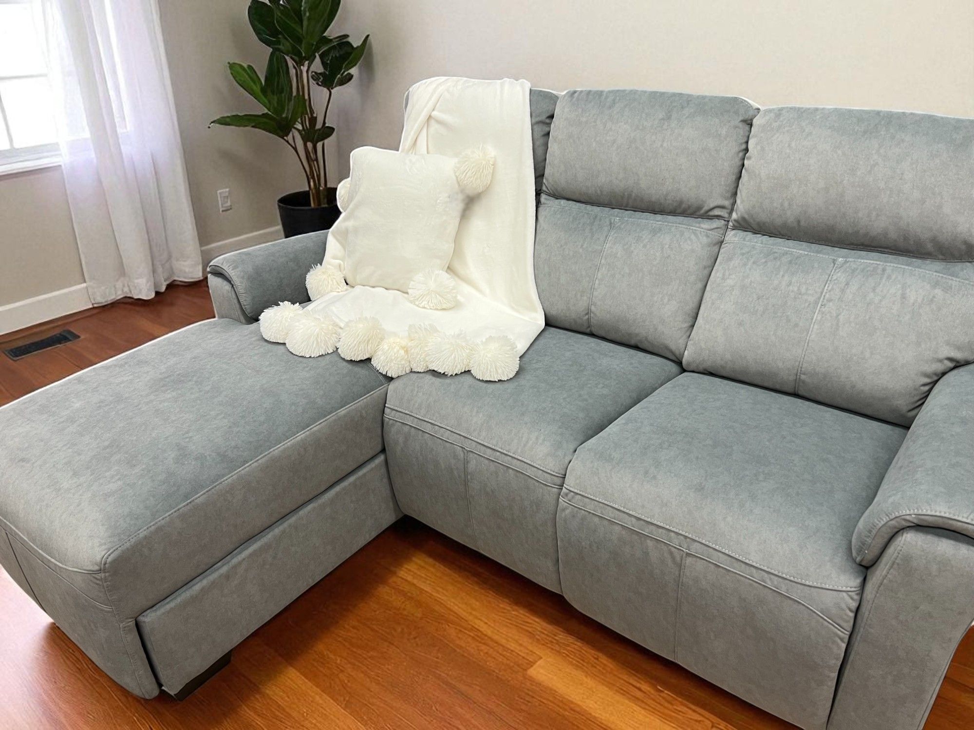 Ce magnifique sectionnel au tissu gris doux effet suède doux est à la fois élégant, spacieux et incroyablement confortable. Doté d’une chaise longue généreuse, il offre un espace parfait pour relaxer, lire ou regarder la télé en tout confort. Son design aux lignes épurées et son dossier bien rembourré ajoutent une touche de style contemporain à n’importe quel salon.
