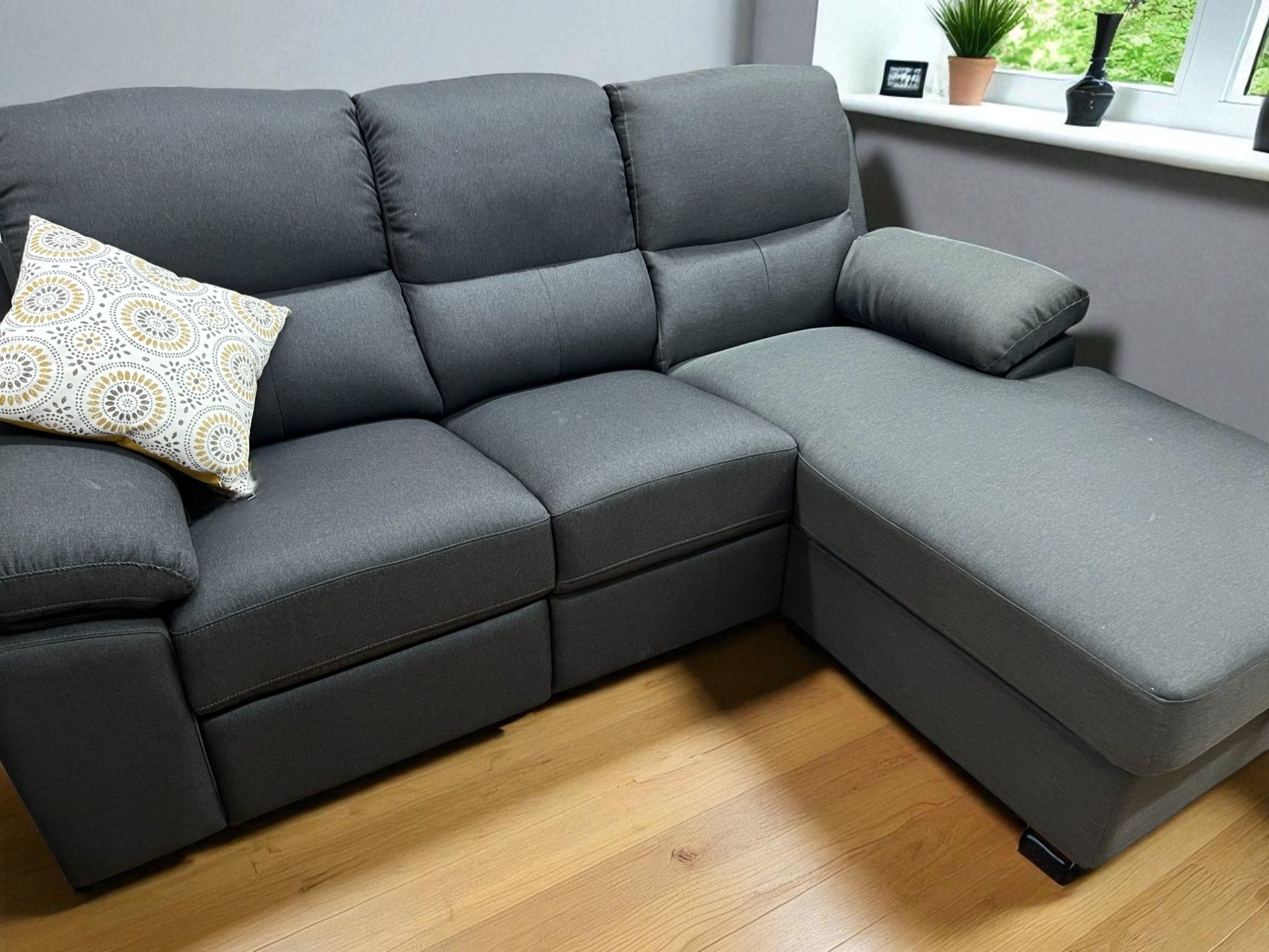 Une des places s’incline manuellement, vous permettant de vous détendre pleinement après une longue journée. La méridienne, quant à elle, cache un grand compartiment de rangement idéal pour vos couvertures, coussins ou accessoires du salon.