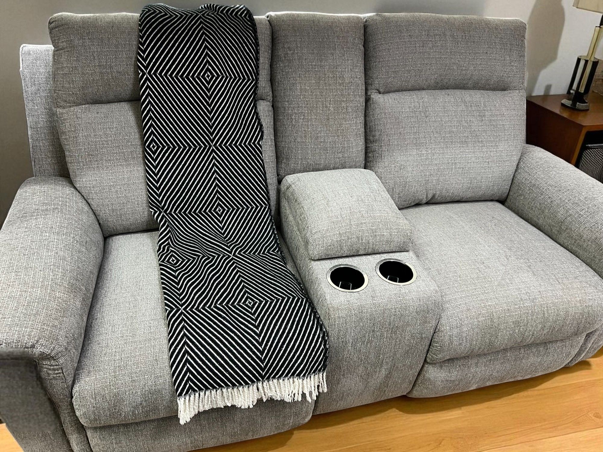 La console centrale pratique comprend deux porte-gobelets et un couvercle rembourré servant de repose-bras ou d’espace de rangement. Grâce aux ports USB intégrés, vous pouvez recharger vos appareils sans quitter votre cocon de détente.