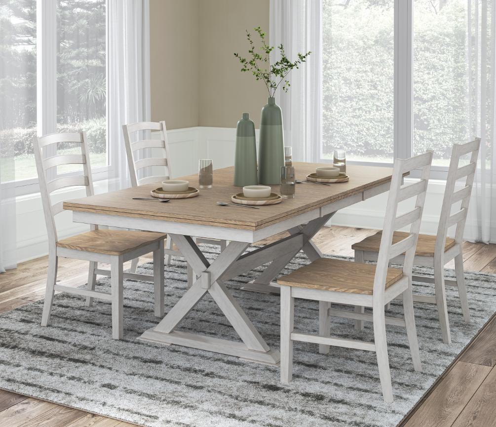 Design bicolore : plateau et assises en fini naturel contrastant avec une base blanc antique