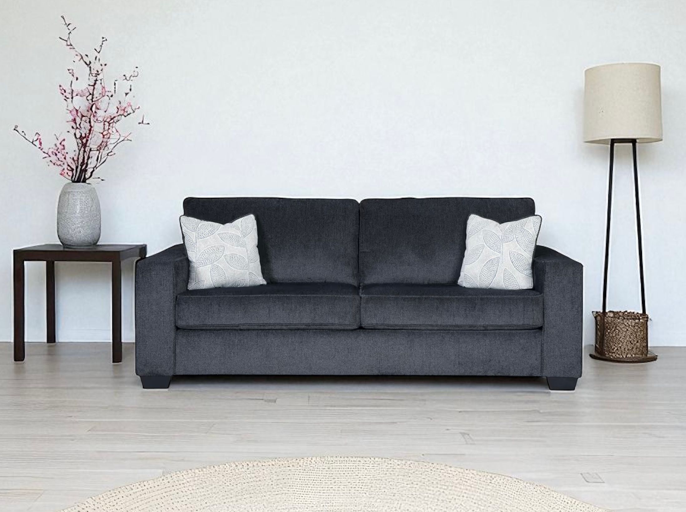 Inclus : deux coussins décoratifs au motif floral discret qui ajoutent une note fraîche et tendance.